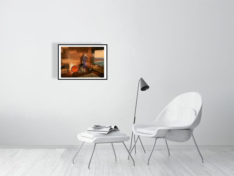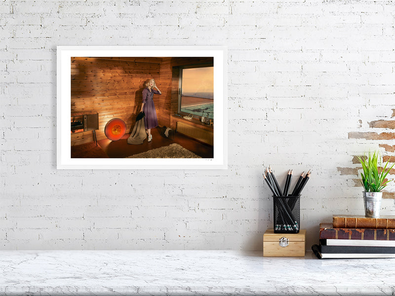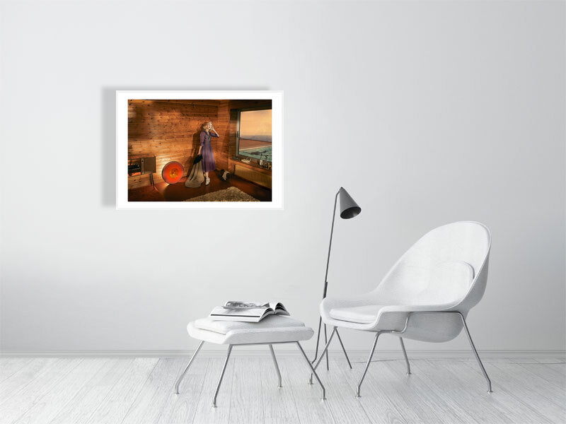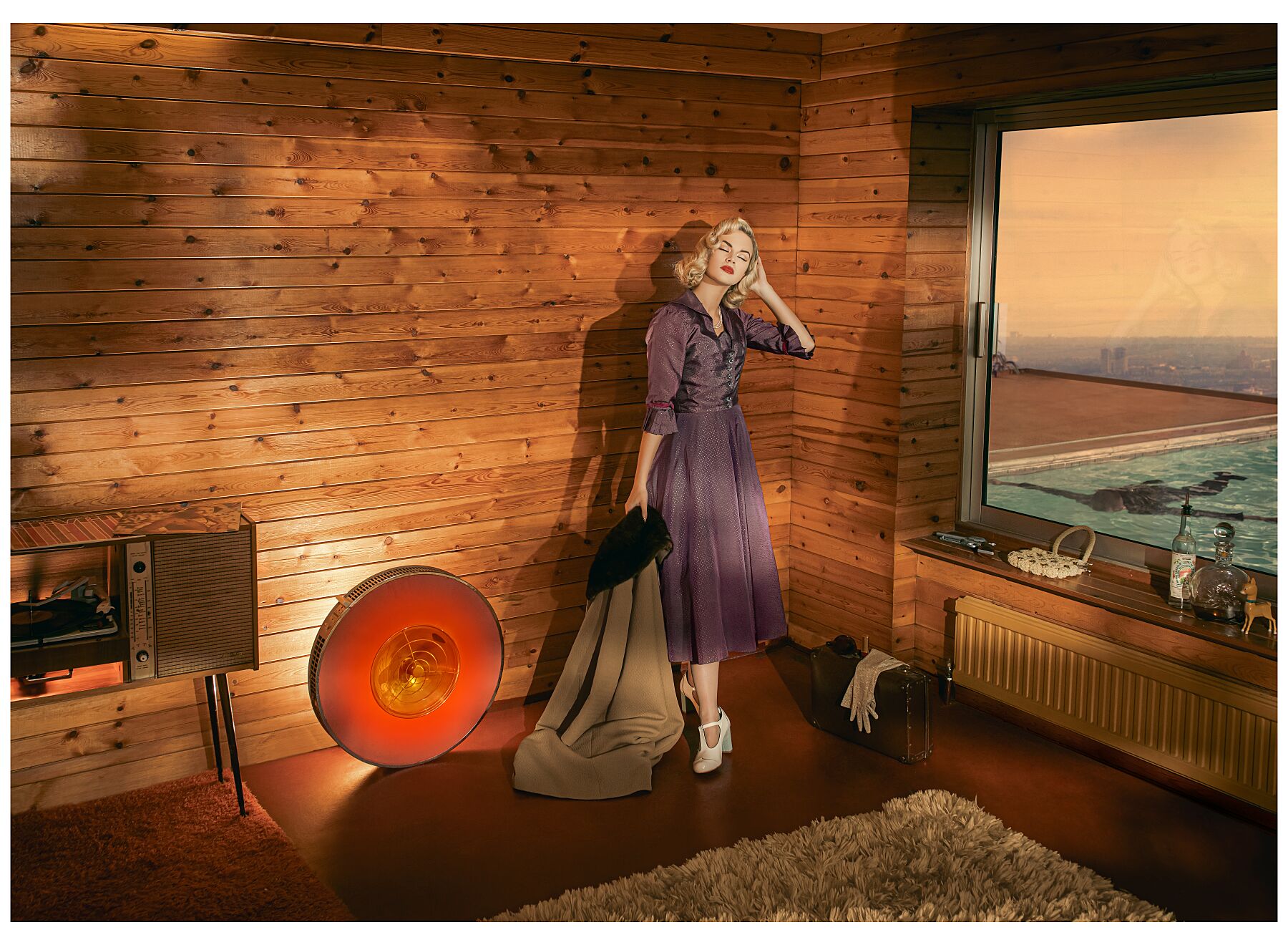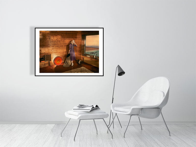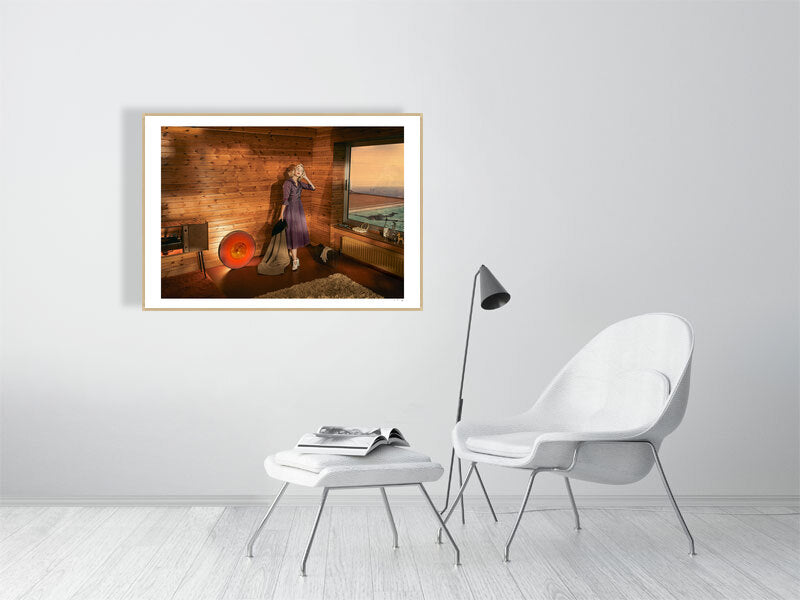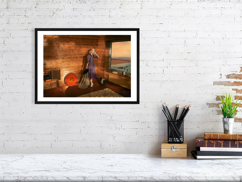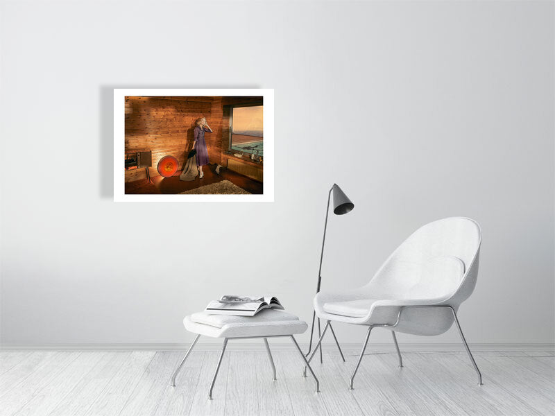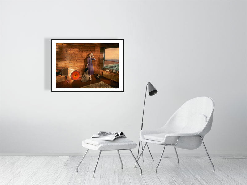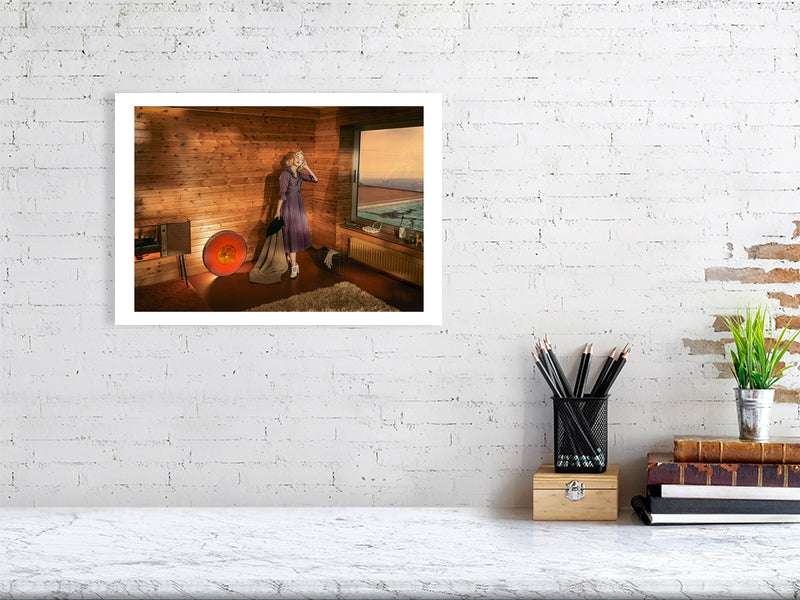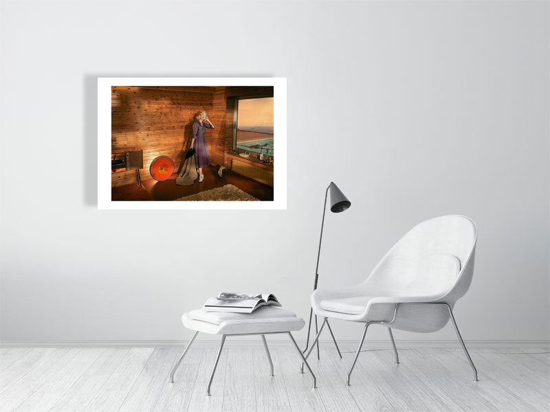 The image depicts a captivating scene where a woman in a purple dress takes centre stage. Standing in front of a window, her expression thoughtful, her posture relaxed yet contemplative. The room's decor is both cozy and eclectic, which contrasts with the scene unfolding in the pool outside.